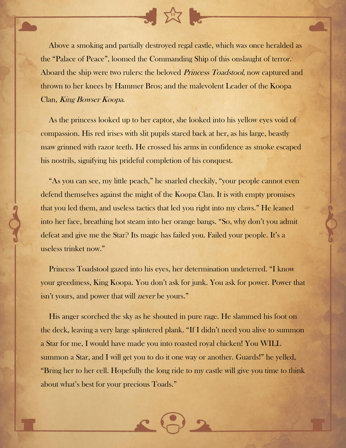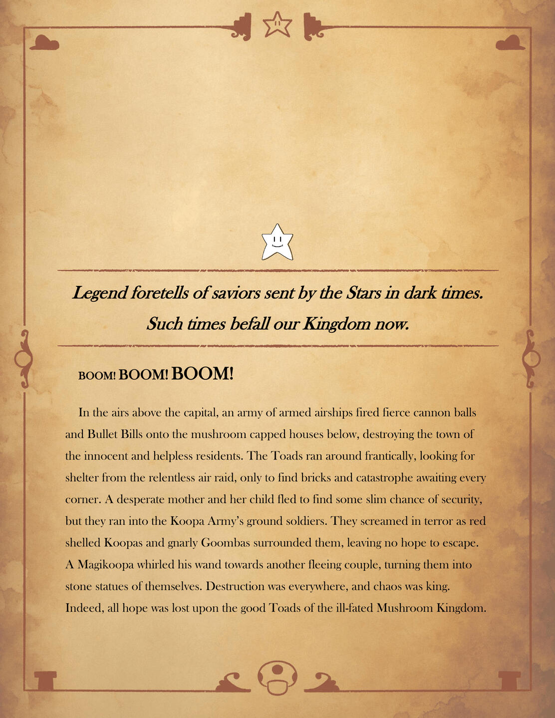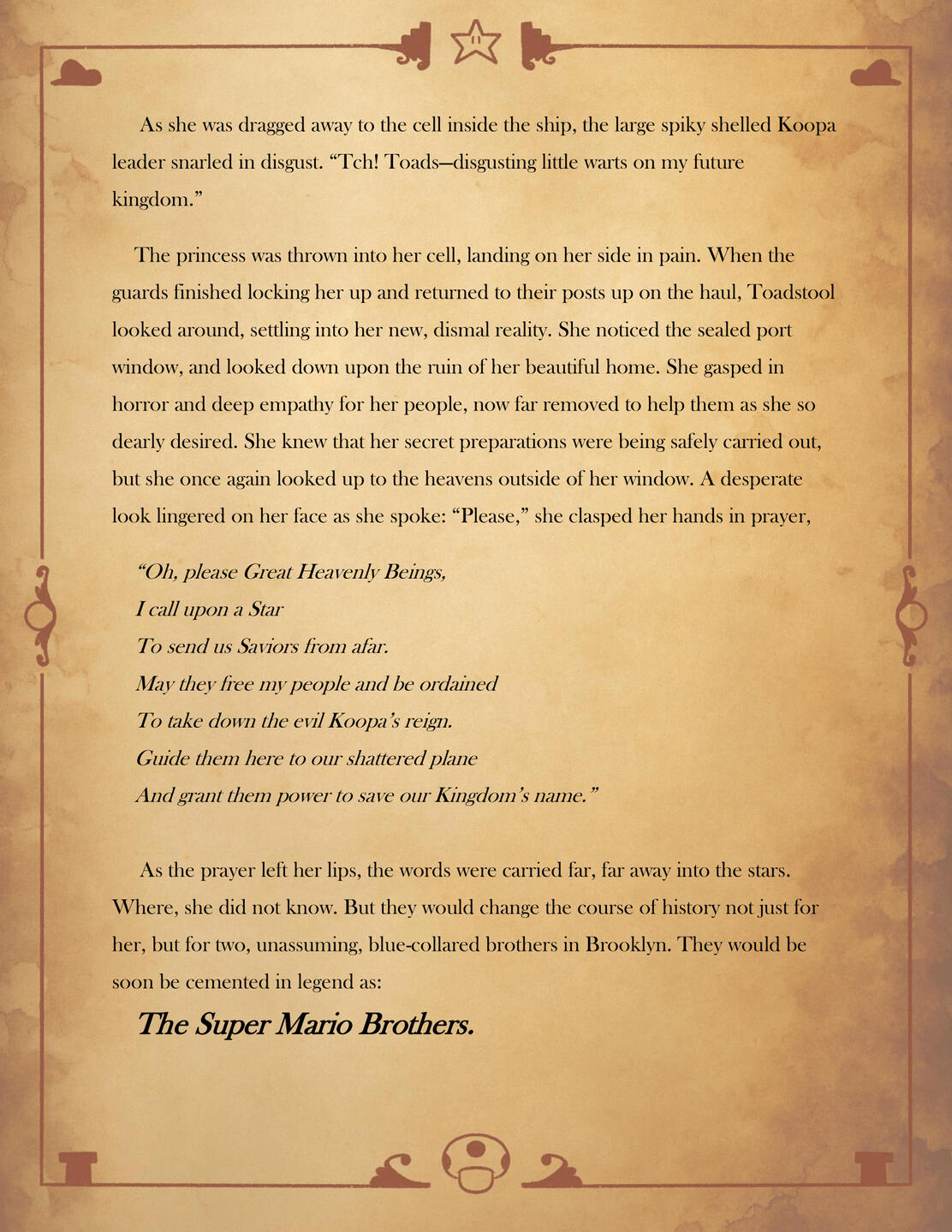 Inspired by classic fantasy films of the 70s and 80s, this fan made digital novel retells the first adventure of the Super Mario Bros. This passion project is filled with original designs and illustrations that are sure to capture that original fantasy setting that inspired the first game.This is the official novelization of my Mario Bros. 80s AU. Read it here on these websites! Or read the prologue here!